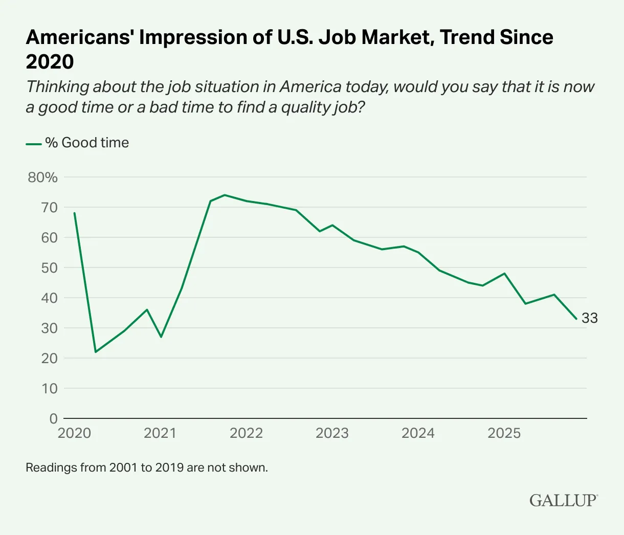 The proximate cause of the K-shaped economy is a weak job market. As I’ve written repeatedly, the U.S. economy has not (yet) experienced mass layoffs. Employers have, however, become very reluctant to hire new workers. Gallup asks whether now is “a good time or a bad time to find a quality job”: