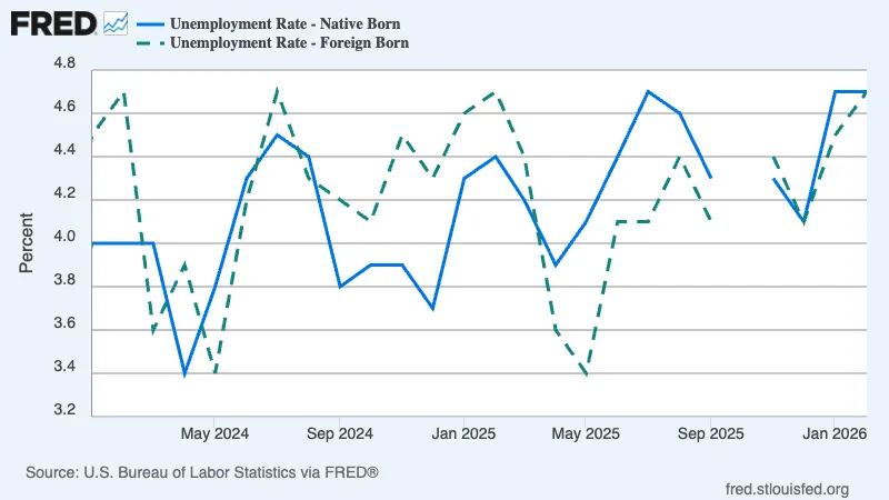 Now, you might be tempted to argue that while stopping immigration reduces overall job growth, it surely must increase job opportunities for native-born workers. But a look at unemployment rates suggests that the job market for the native-born has gotten (slightly) worse, not better: