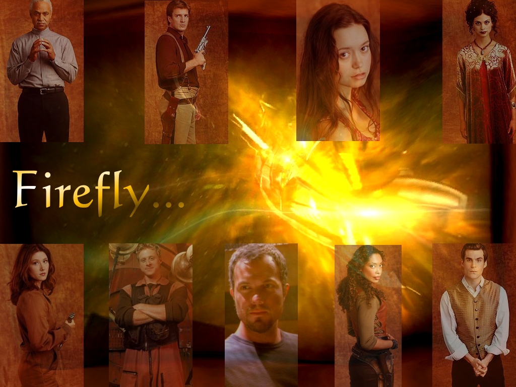 Wallpaper with small images of cast, and Serenity in background.